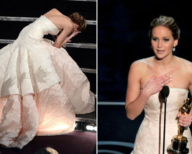 The actress, who joked on the red carpet that she hadn't eaten all day, wound up tripping on the stairs on her way to accept her Oscar for Best Actress for "Silver Linings Playbook."